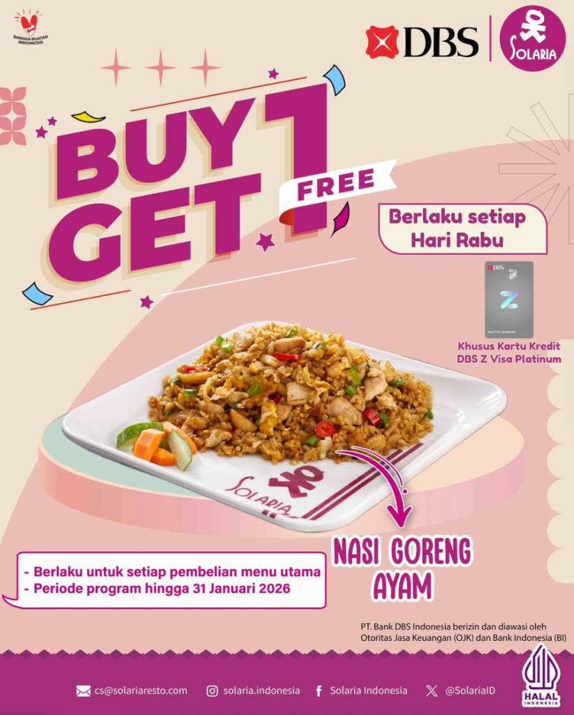 Rayakan Rabu seru bareng Solaria dan nikmati FREE Nasi Goreng Ayam! 😍 Cukup beli 1 menu makanan dan bayar pakai kartu kredit DBS Z Visa Platinum untuk langsung menikmati promonya. Ajak teman-teman kamu dan merapat ke Solaria sekarang! ✨