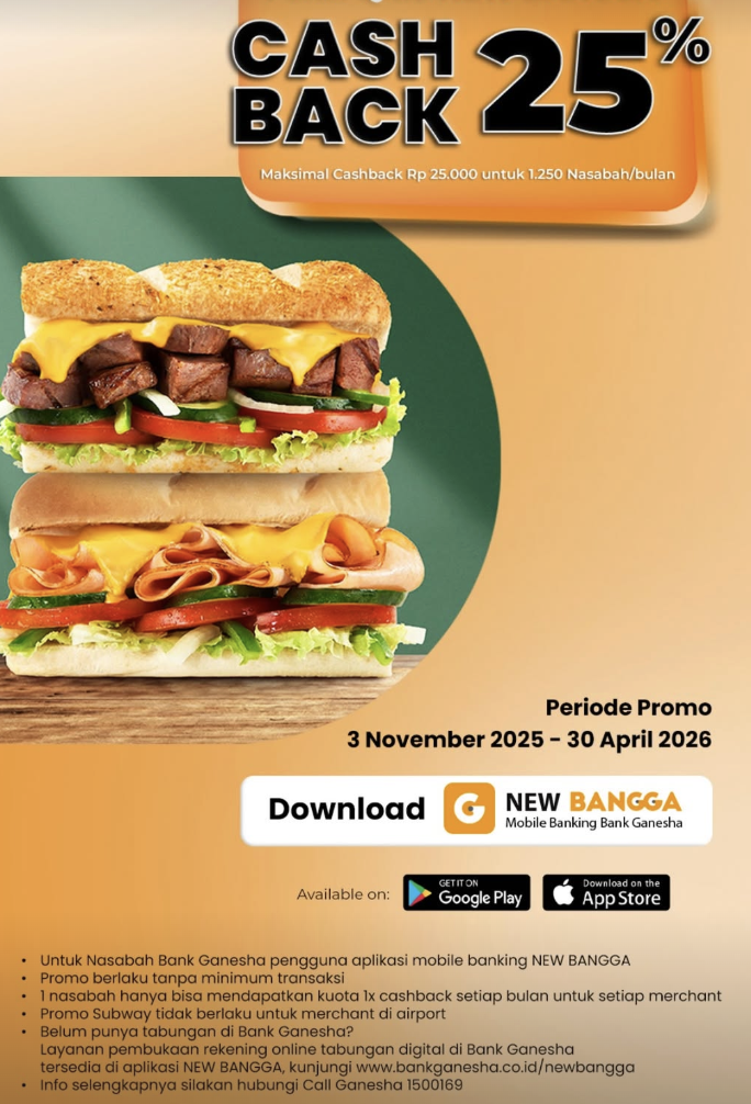 Rayain momen seru bareng Subway dan dapatkan cashback 25%! 🥪 Pakai QRIS NEW BANGGA dan nikmati cashback hingga Rp25.000 dengan transaksi di Subway.