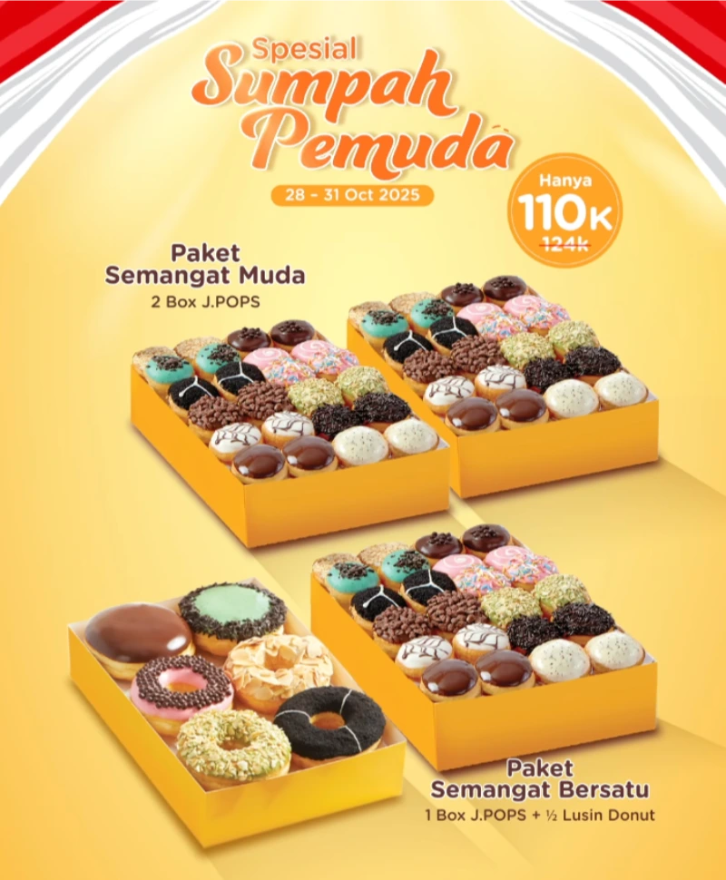 Rayain semangat muda bareng J.CO di momen Sumpah Pemuda 2025! 🇮🇩 Nikmatin donat manis dan JPOPS favorit dengan harga spesial yang bikin hari kamu makin seru. Yuk, ajak bestie kamu buat nongkrong sambil nikmatin promo manis ini! 🍩✨