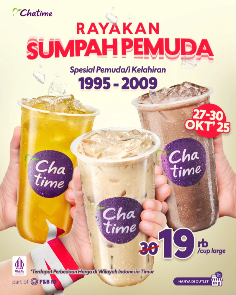 Rayain semangat muda di Hari Sumpah Pemuda bareng Chatime! 🧋 Dapetin minuman favorit ukuran LARGE cuma Rp19.000/cup aja! Biar makin seru, promo ini khusus buat kamu yang lahir antara tahun 1995–2009. Cukup tunjukin identitas diri pas transaksi dan nikmatin kesegaran Chatime pilihanmu! 💜
