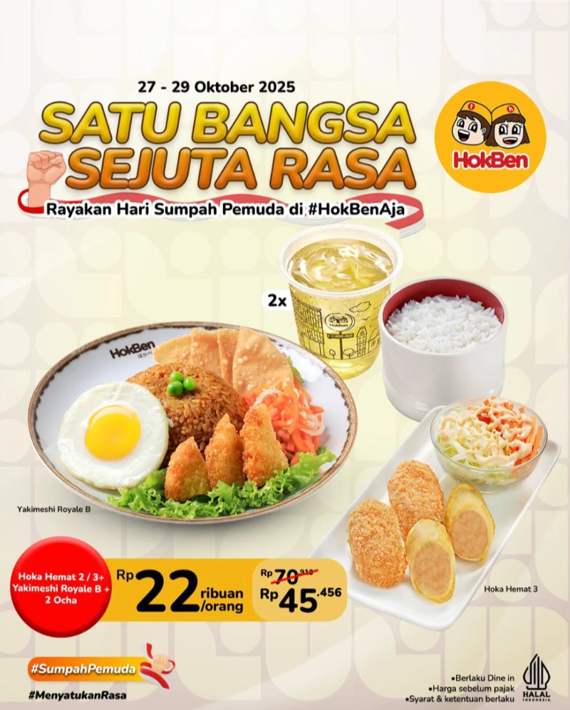 💡 Catatan: Berlaku hanya untuk pembelian langsung di store. Yuk, rayain Hari Sumpah Pemuda sambil nikmatin menu penuh rasa dari HokBen!