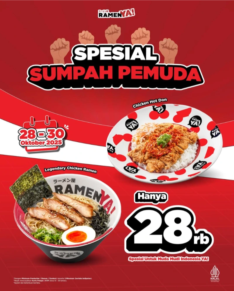 Rayain semangat Sumpah Pemuda bareng RamenYA! 🍜 Nikmatin kehangatan Legendary Chicken Ramen atau Chicken Hot Don cuma seharga Rp28.000 aja! Waktunya manjain perut dengan cita rasa Jepang yang otentik tanpa bikin kantong jebol. 😋