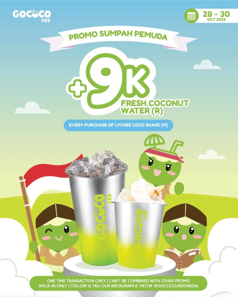 Segerkan harimu bareng GOCOCO di momen Sumpah Pemuda kali ini! 🥥✨ Dapatkan promo spesial yang bikin haus langsung hilang — cukup beli 1 Lychee Coco Shake (Medium) dan kamu bakal dapet 1 Fresh Coconut Water (Regular) cuma dengan Rp9.000 aja! Seger, hemat, dan cocok banget buat nemenin semangat muda kamu! 💦