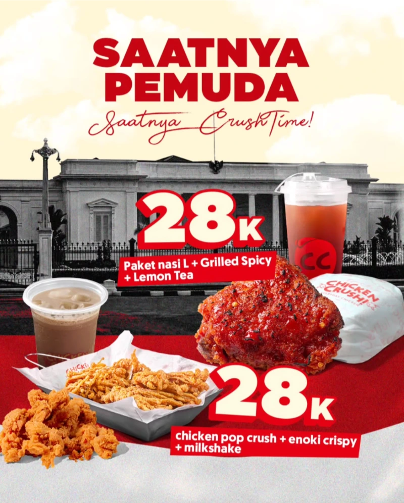 Rayain semangat Sumpah Pemuda bareng Chicken Crush yang lagi kasih promo super hemat cuma 1 hari aja! 🍗 Nikmatin paket spesial lengkap mulai dari ayam grilled sampai milkshake segar, semuanya cuma Rp28.000 aja! 😋