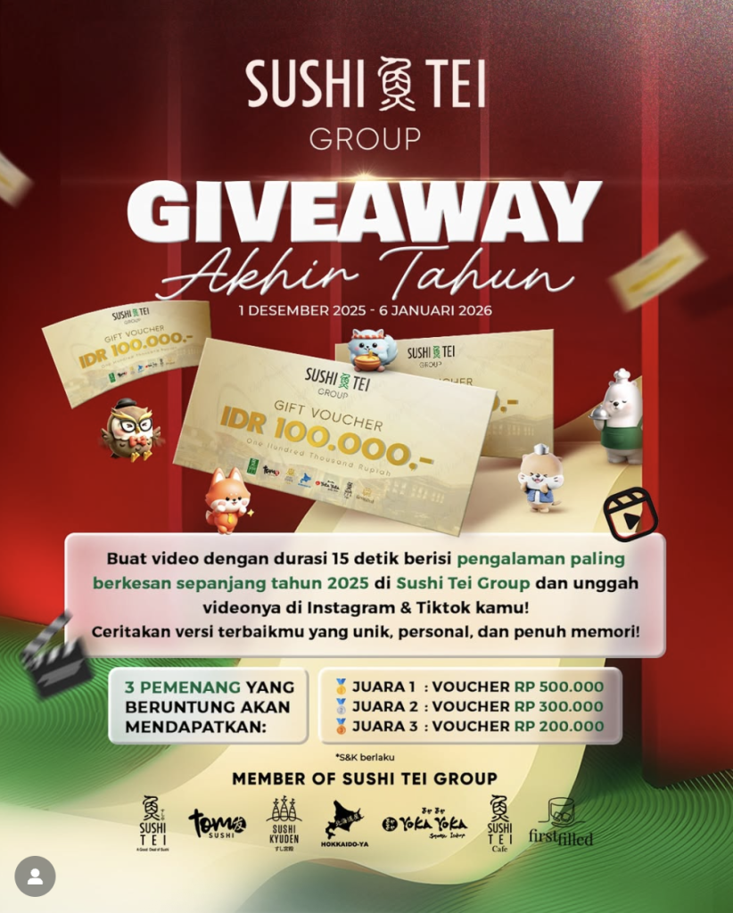 💡 Catatan: Upload video berdurasi maksimal 15 detik di Instagram atau TikTok dengan menceritakan momen berkesan kamu di outlet Sushi Tei Group. Pemenang akan mendapatkan e-voucher Sushi Tei Group senilai hingga Rp 500.000!