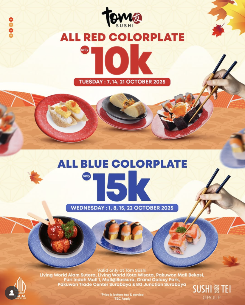 Promo Tom Sushi adalah jalan ninja buat kamu yang mau makan sushi puas tanpa drama dompet menipis. Mulai dari paket all you can eat, piring warna-warni dengan harga spesial, sampai promo seru dari berbagai bank pilihan. Yuk, simak daftar lengkapnya—biar kamu nggak ketinggalan dan bisa langsung serbu!