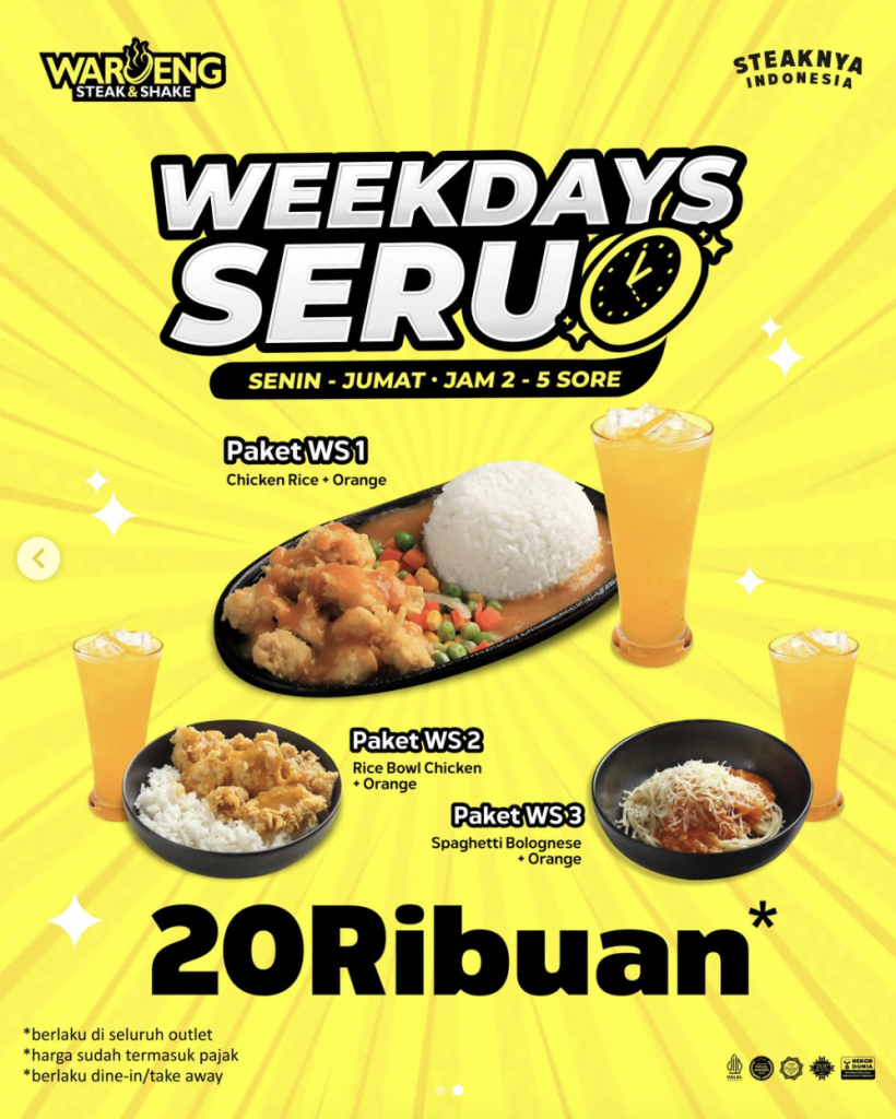 Seru-seruan weekday bareng teman makin lengkap di Waroeng Steak! 🥩✨ Nikmatin menu spesial favorit mulai dari cuma Rp20 ribuan aja, cocok buat nongkrong hemat tapi tetap nikmat!