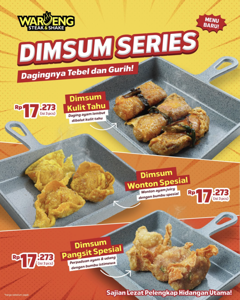 Cobain sensasi baru makan steak rame-rame bareng keluarga atau sahabat di Waroeng Steak & Shake makin lengkap dengan Dimsum Series yang baru aja launching! 🥟✨ Dagingnya tebel, gurih, dan pas banget jadi snack pendamping steak favoritmu.
