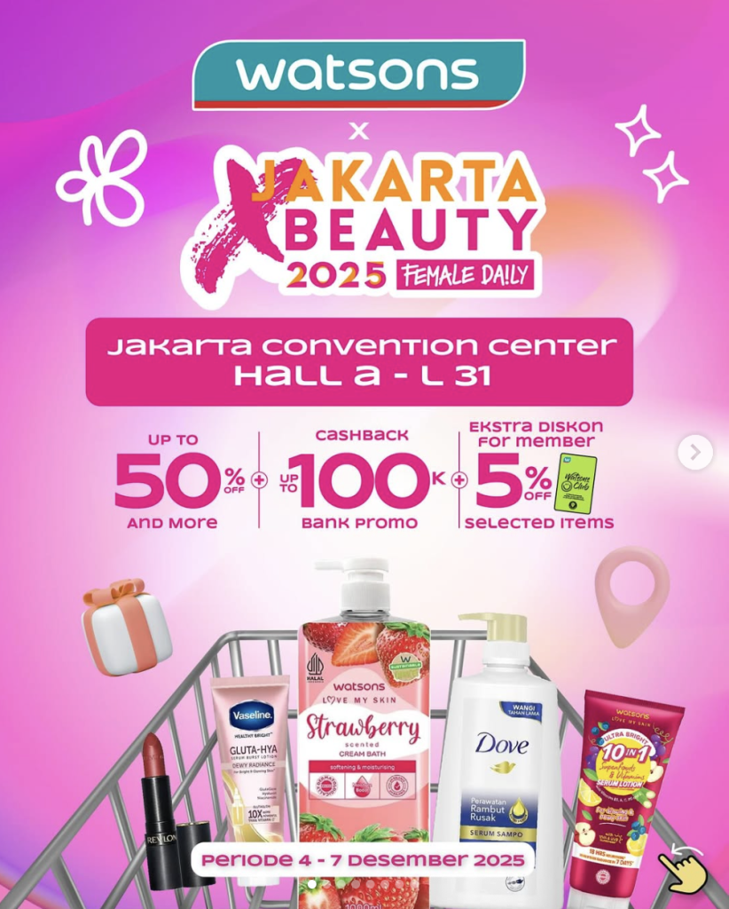 Rayain momen seru bareng Watsons di Jakarta Beauty 2025! 💄 Nikmatin diskon hingga 50% dan cashback hingga Rp100.000, plus ekstra diskon 5% untuk member!