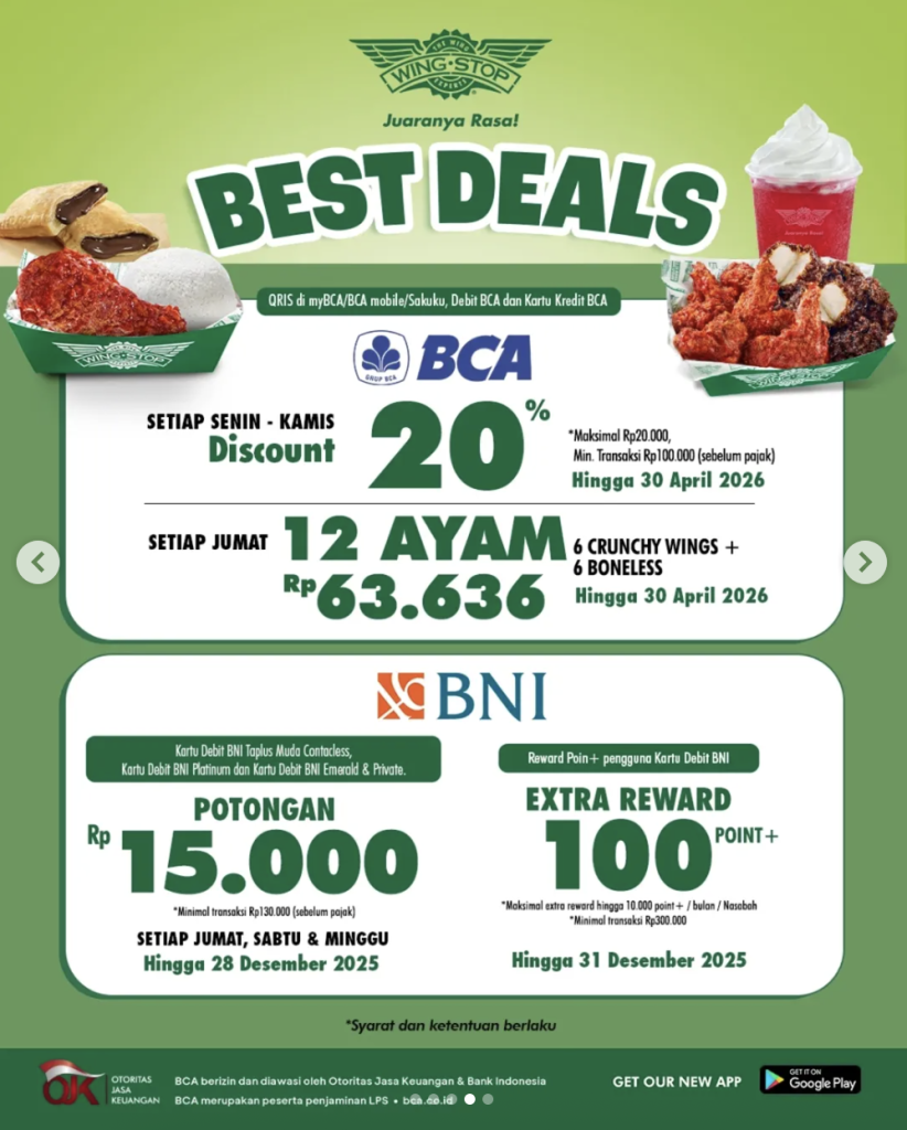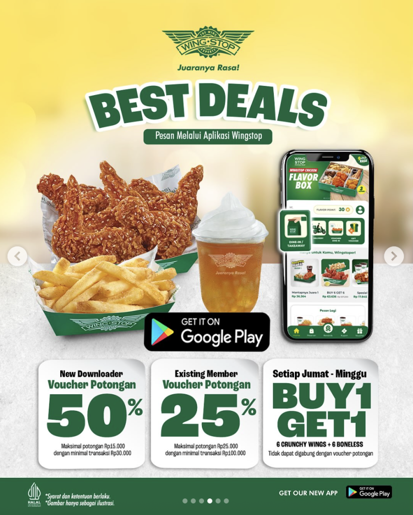 Dari diskon besar-besaran, combo spesial, hingga cashback, Wingstop selalu punya cara buat bikin pengunjungnya betah balik lagi. Yakin nih, nggak mau cobain ayam gurih dan sausnya yang nendang?