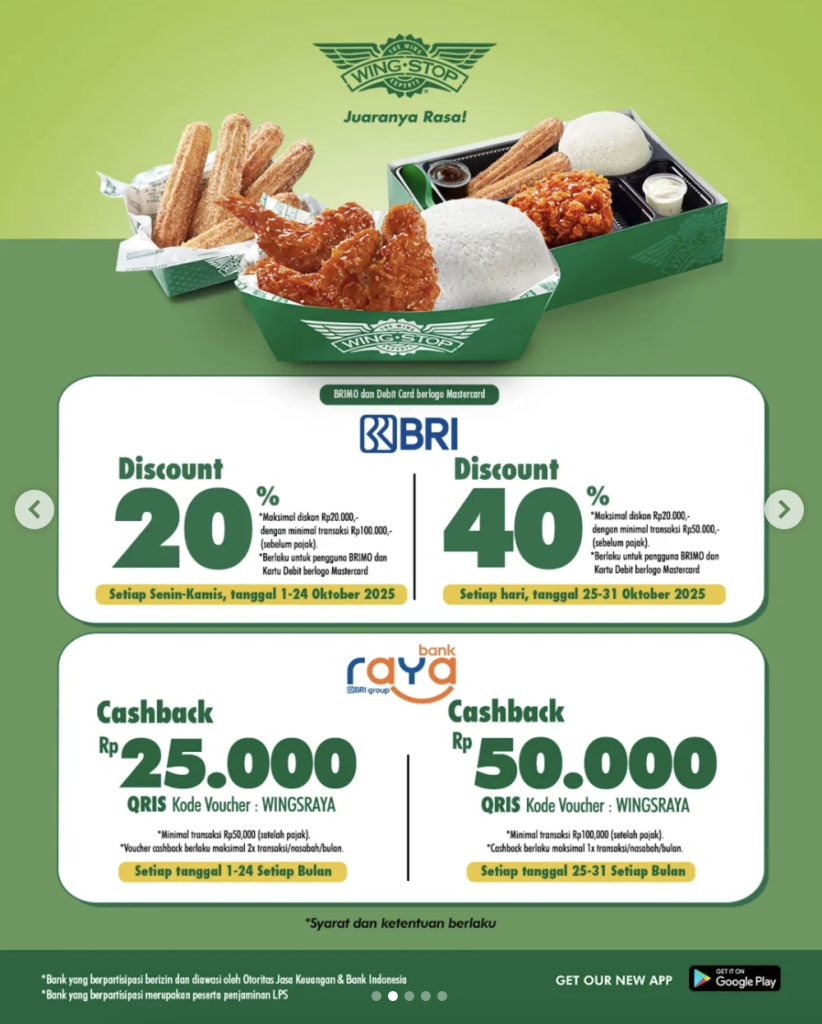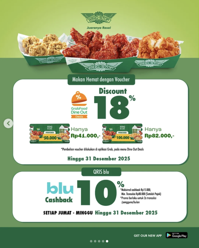 Rayain momen hemat bareng Wingstop dengan promo spesial! 🍗 Banyak pilihan voucher dan cashback yang bikin makan jadi makin puas tanpa bikin kantong tipis.