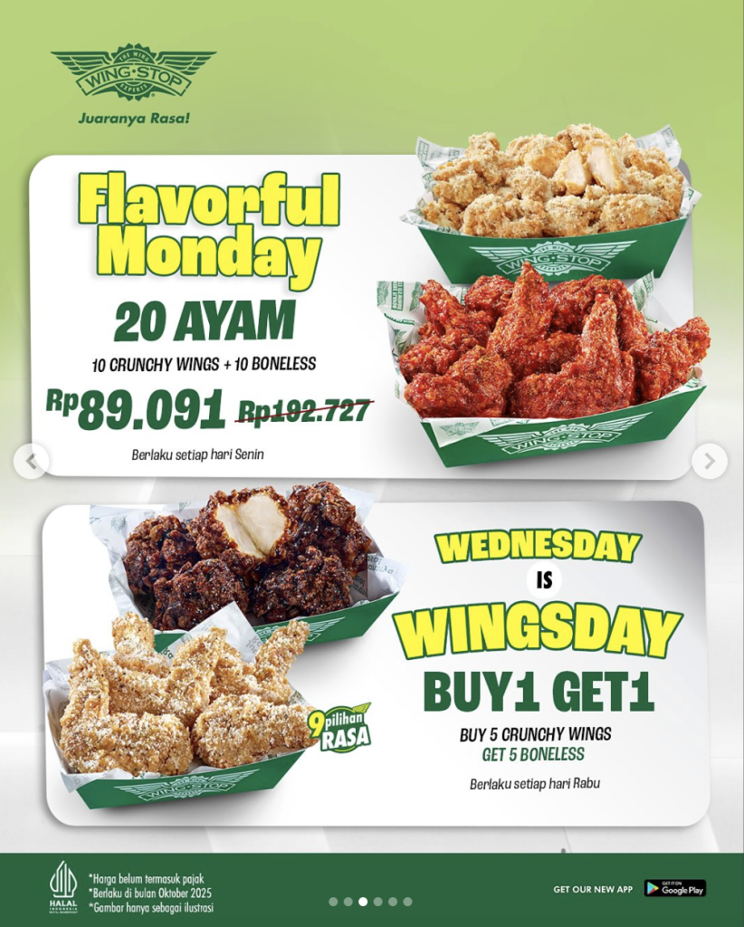 Rayain awal minggu dan pertengahan minggu bareng promo spesial Wingstop! 🍗 Ada paket hemat yang bikin makan rame-rame makin seru, plus promo buy 1 get 1 yang sayang banget kalau dilewatin.