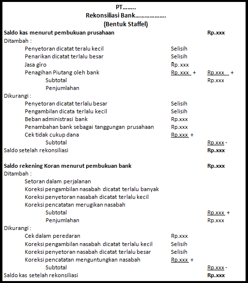 Berikut contoh penyajian rekonsiliasi bank dalam bentuk staffel: