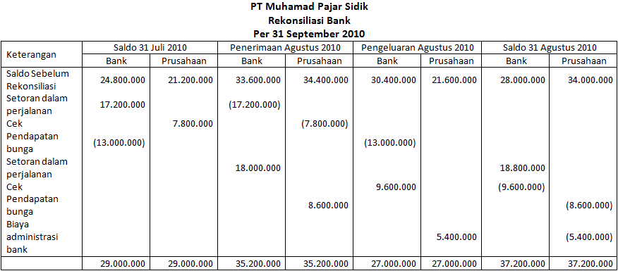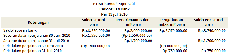 Berikut contoh penyajian rekonsiliasi bank dalam bentuk empat kolom: