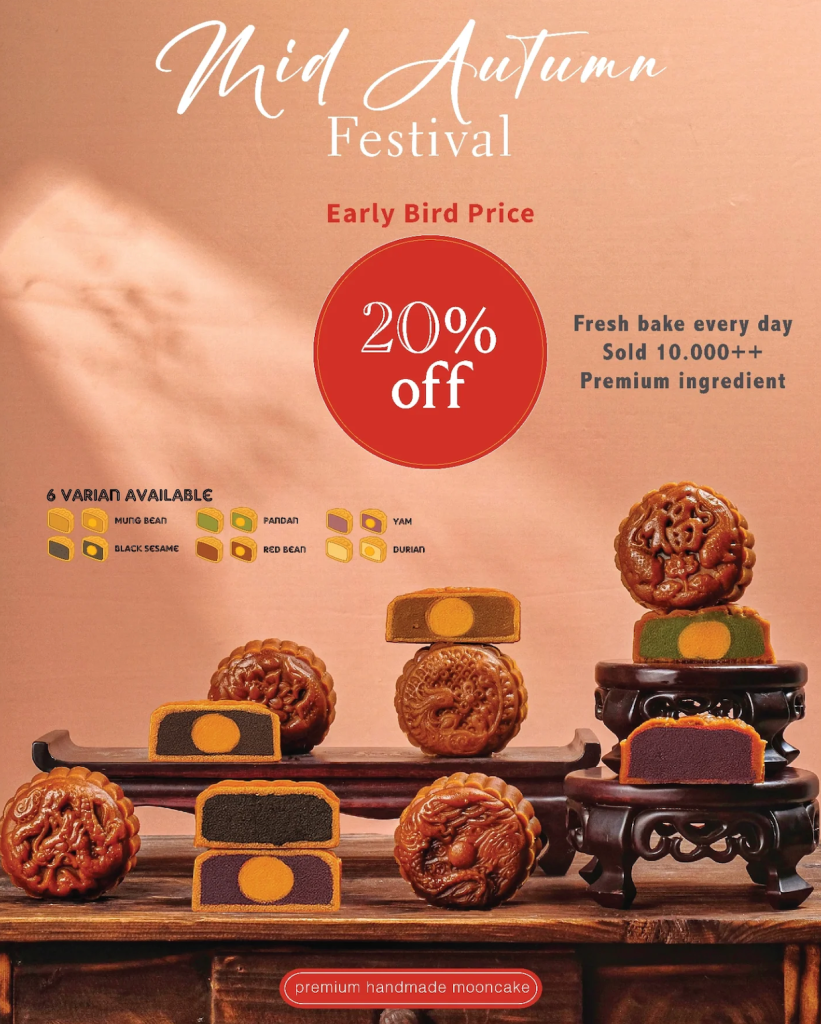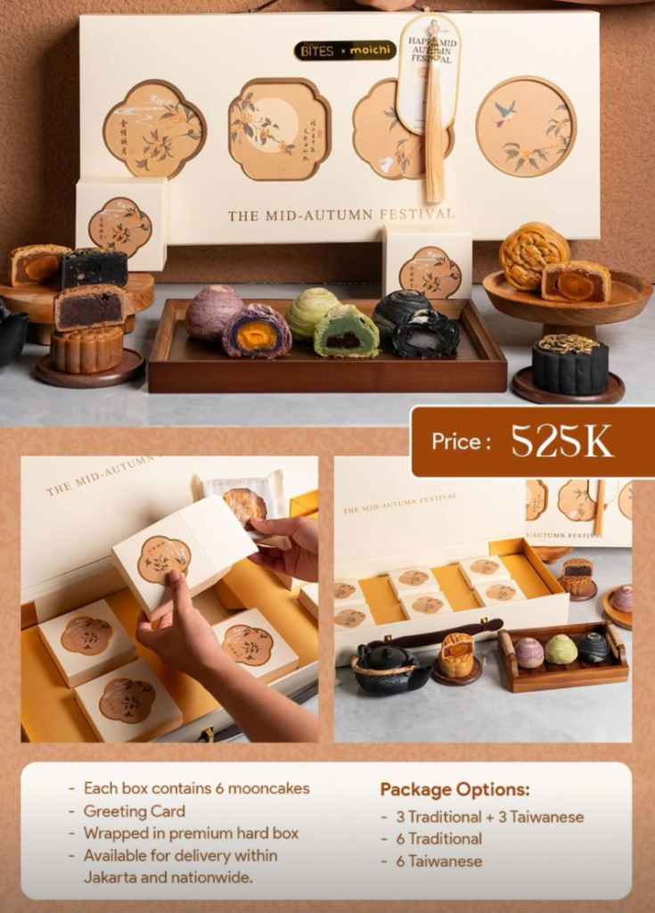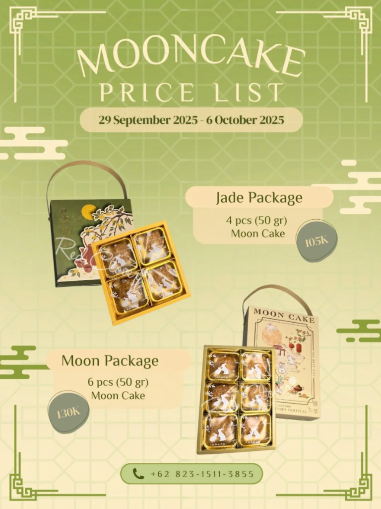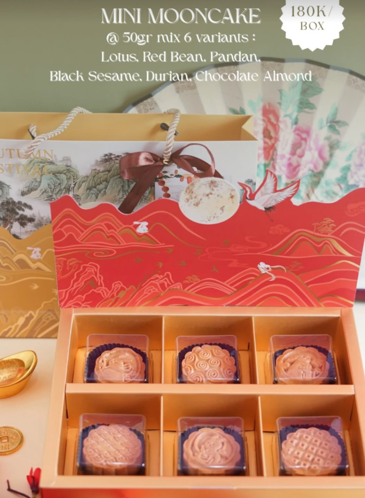 - Traditional Mooncake: Rp375.000 (8 pcs rasa Black Sesame, Red Bean, Lotus, dan White Lotus).