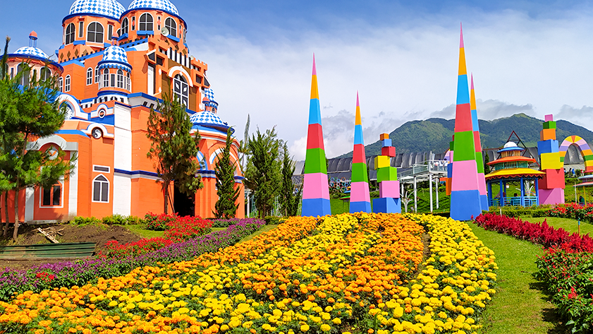 - Daya tarik: taman bunga warna-warni, miniatur landmark dunia, suasana sejuk pegunungan.