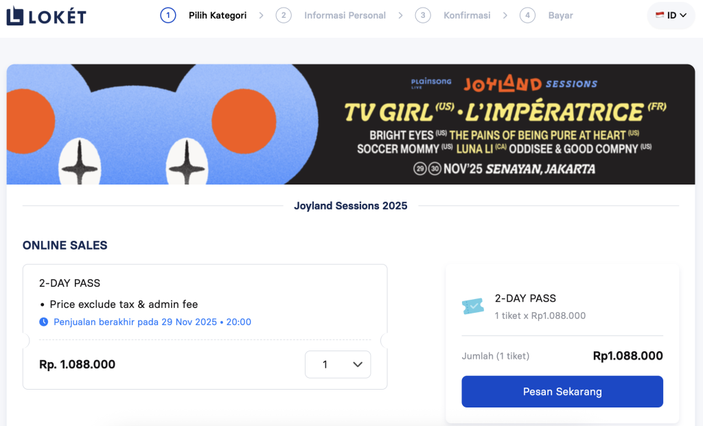 Penjualan tiket resmi dibuka pada Rabu, 17 September 2025 pukul 12.00 WIB melalui situs joylandfest.com dan Loket.