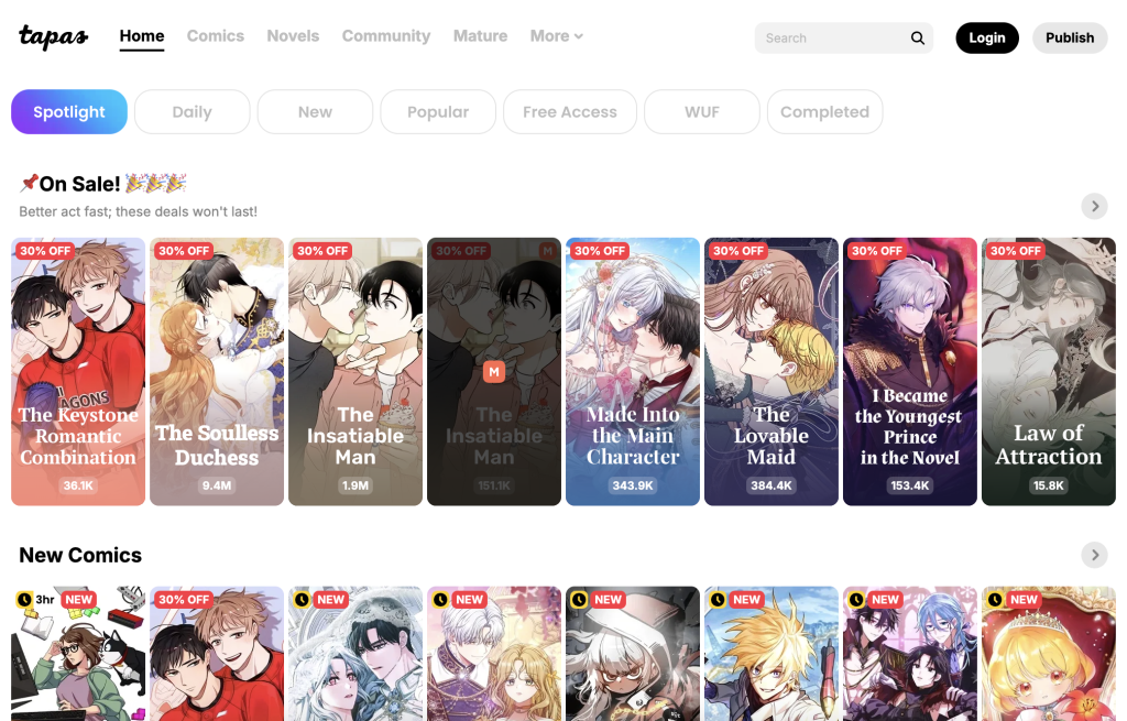 Tapas nawarin berbagai genre manhwa yang lengkap mulai dari fantasi, romance, drama, hingga komedi. Situs ini memungkinkan pengguna ngumpulin poin dengan menonton video atau mengundang teman untuk membuka episode tertentu. Tapas juga ngasih hadiah poin untuk pengguna yang aktif. Cocok untuk yang suka koleksi cerita beragam dan fitur interaktif.