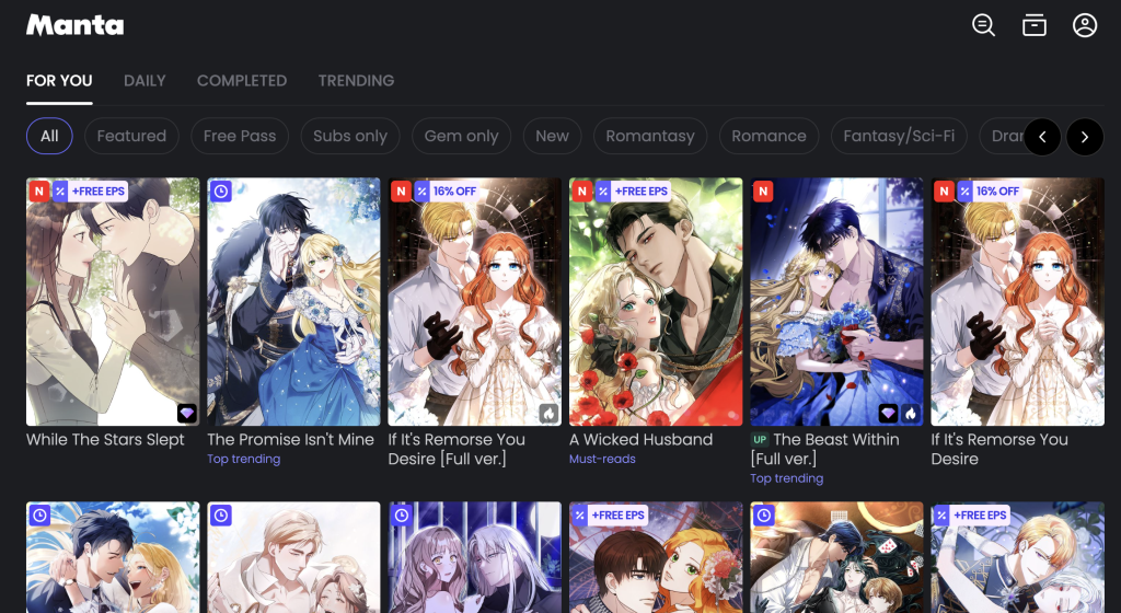 Manta Comics termasuk pendatang baru dengan koleksi lengkap beragam manhwa. Keuntungan besar disini adalah bebas gangguan iklan saat membaca, membuat pengalaman membaca jadi lebih nyaman. Manta populer di kalangan anak muda yang ingin menikmati manhwa tanpa distraksi/