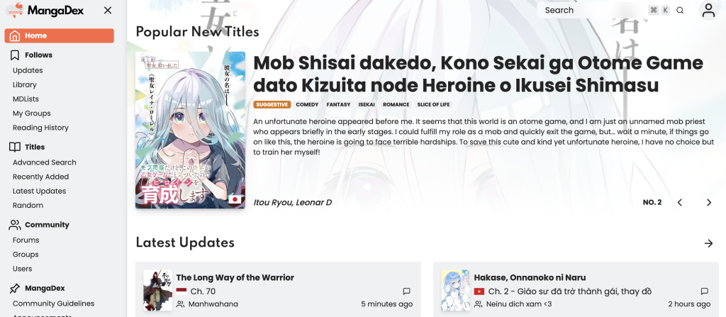 MangaDex nyediain koleksi manhwa, manga, dan manhua lengkap dan gratis dengan dukungan banyak bahasa. Situs ini juga memungkinkan pengguna berpartisipasi aktif dalam komunitas dengan membuat grup atau klub baca online, asyik banget buat nongkrong bareng teman sambil diskusi.