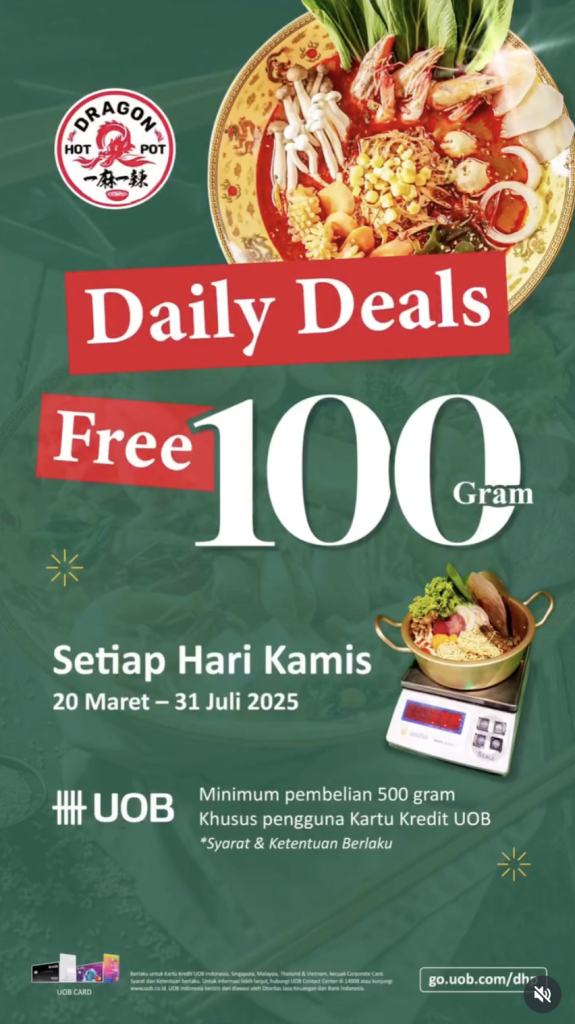 Promo Bayar pake Kartu Kredit UOB, dapet bonus 100gr ingredients di Dragon Hot Pot yang tersedia di Dragon Hot Pot bisa digunakan baik untuk pembelian offline di Grand Indonesia yang terletak di Jakarta maupun pembelian online, tergantung pada ketentuan masing-masing promo. Untuk lebih jelasnya, pastikan Anda mengecek syarat dan ketentuan yang berlaku di Februari 2026 agar bisa memanfaatkan promo dengan maksimal. Jangan lewatkan kesempatan belanja dengan keuntungan ganda ini!